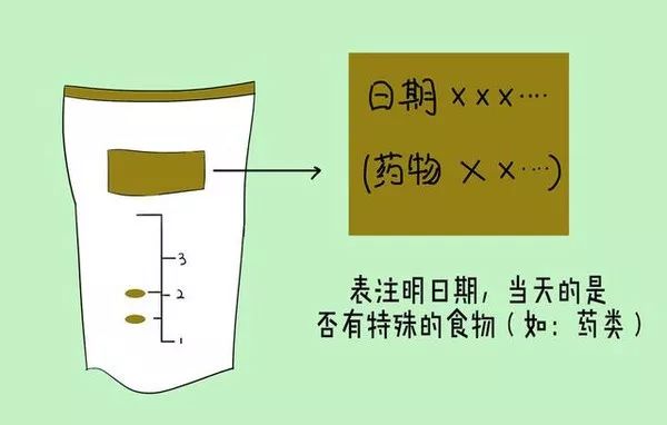 5.每一瓶的乳汁上都要注明当天的日期,日期最早的放在最前面,并写上当天是否有吃过什么不同寻常的东西,如药物等。